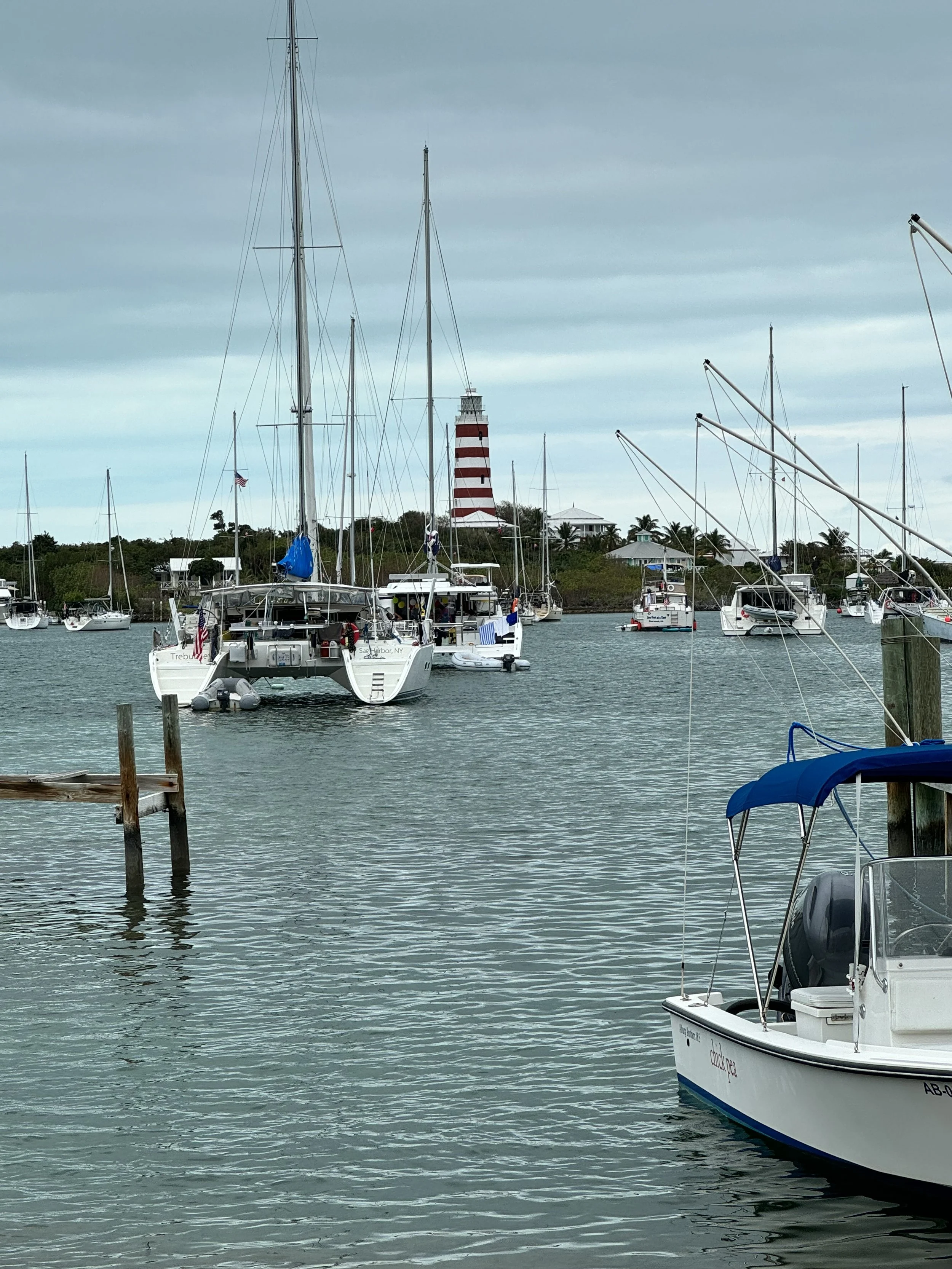 1/8/24 Started our last day off by heading back into Hope Town. We headed to the light house first and climbed to the top (well almost for some of us). We met some local boat folks from NC that were headed in to play pickle ball. Saw yet another liquor store and a few souvenir/ t-shirt shops. Got some ice-cream for Ella’s breakfast and headed back to the boat. Had lunch and headed out to get back to Marsh Harbor. The Boomerang crew raced us and won by a long shot but we were enjoying a leisurely last sail with all of us on the boat. 21 nautical miles.