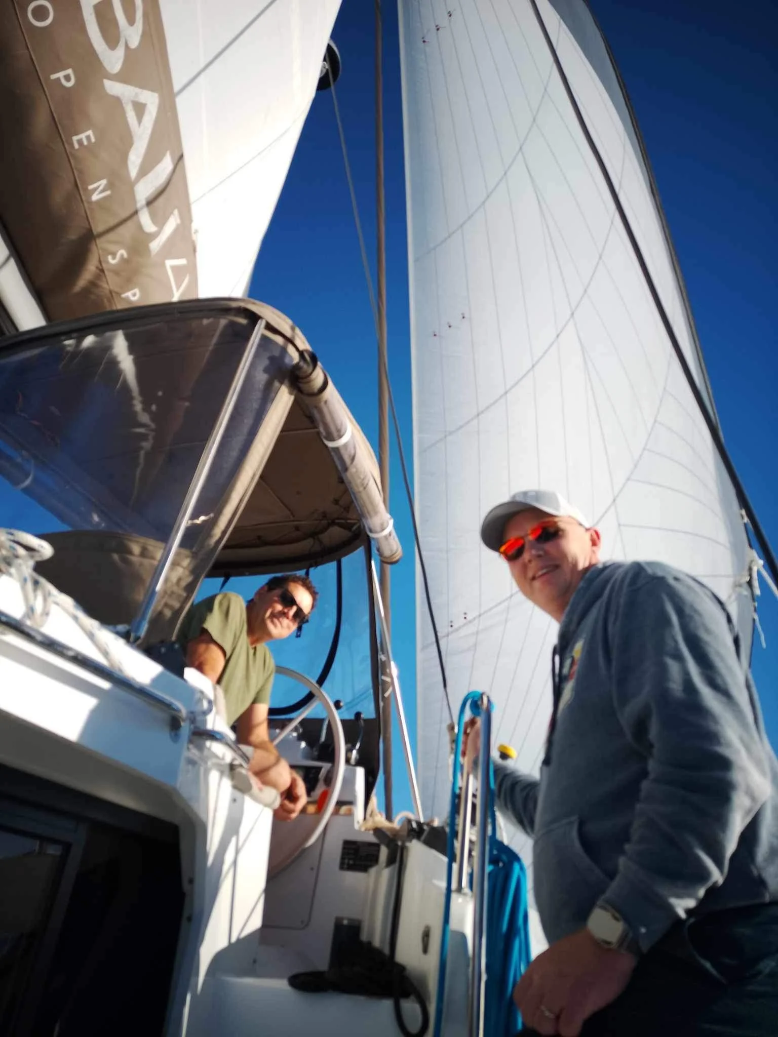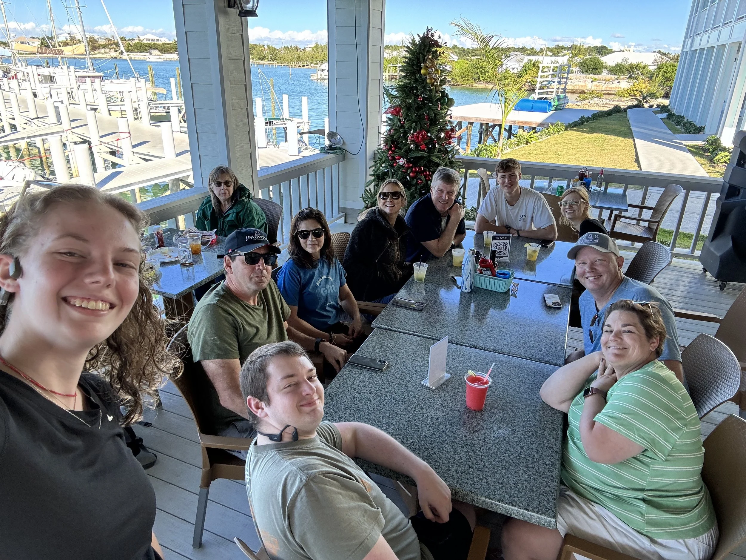 1/1/24 After our early night in Little Harbor we left in the morning heading to Marsh Harbor. A nice quiet smooth ride was enjoyed by all. We got to fly the code zero and main sail finally . We stopped just before Marsh Harbor for a quick dip. Annie proclaimed it not as cold as Nova Scotia! Ella said “it’s not warm,” but all 4 sawm for a while. They put on snorkels and saw star fish and collected a sea biscuit. We pulled in to fuel up at the Conch Inn and Marina, the best service at a marina we had all trip. The rest of the gang arrived just as we were pulling into our slip. We had a not so great lunch at Snappers. We had a boat full of folks for some fellowship before bed that night. 22 nautical miles covered.