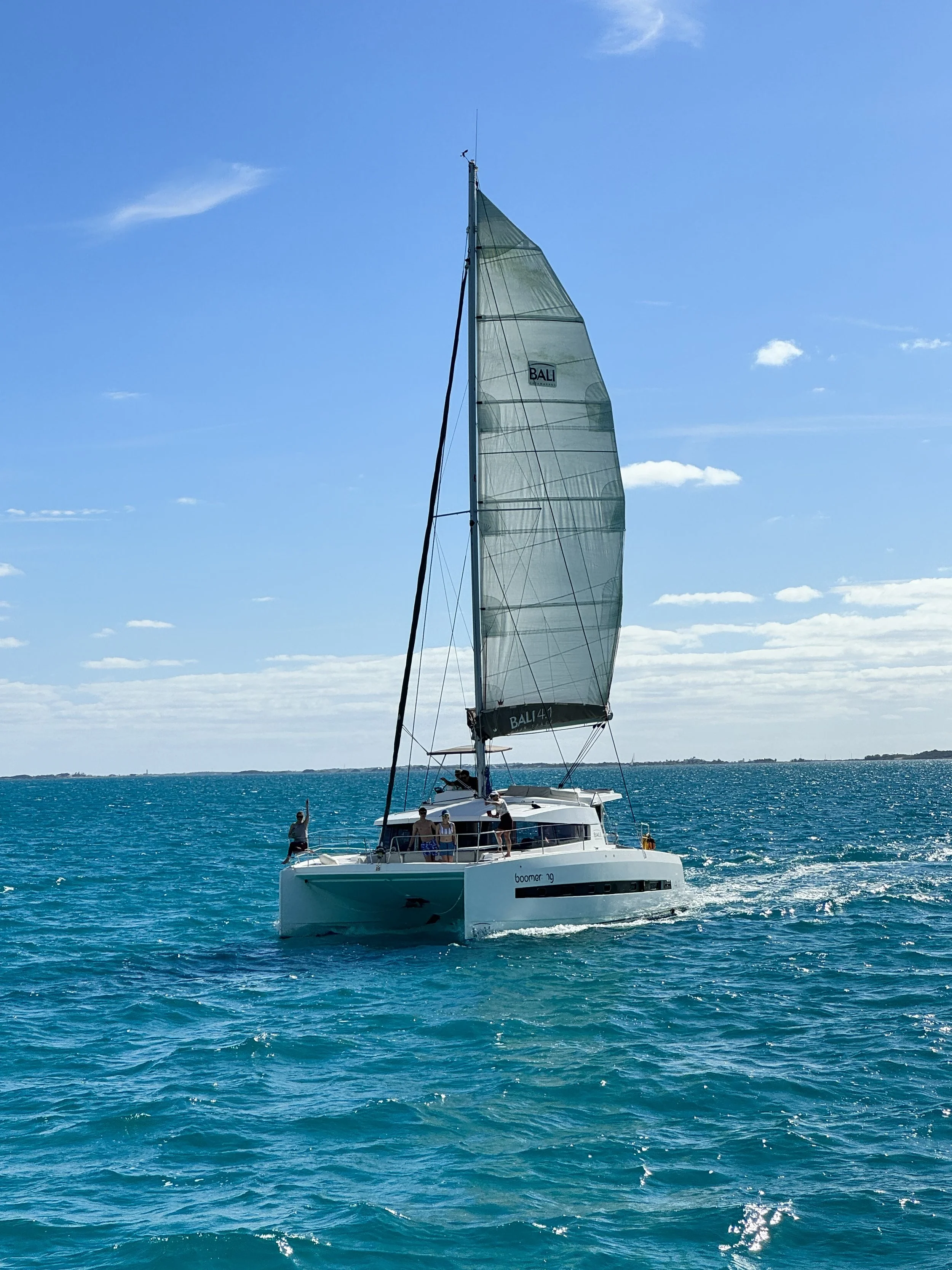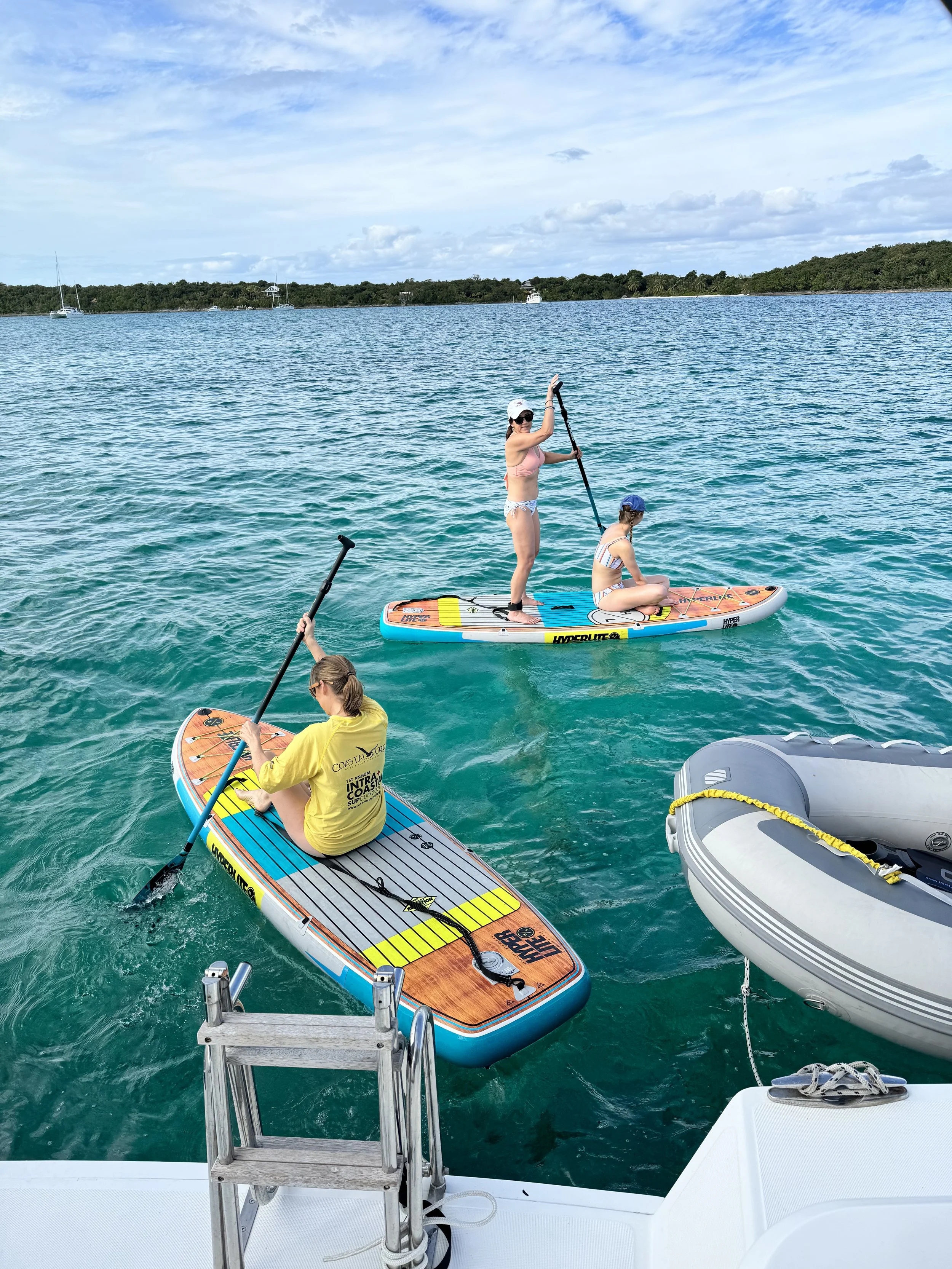 1/3/24 The morning didn’t go quite as planned for the Boomerang crew. Sandy fell on some broken stairs in the boat, then there was an alternator problem that caused a quick turn around just after they got off the dock. We finally got under way and were able to motor sail up to Crab Cay. We anchored and rafted up together for an afternoon outing. Some folks paddle boarded and some snorkeled. We took the dinghy to Nunjack Harbor and saw some giant starfish, a few turtles and a lot of grass on the bottom. We came back to the boat and motored back down to Green Turtle Cay for the night. We hopped on a mooring ball and went out to dinner at the Boathouse Marina. Great service and a good time. We hung out back at the boat for some games and fun. 27 nautical miles covered.